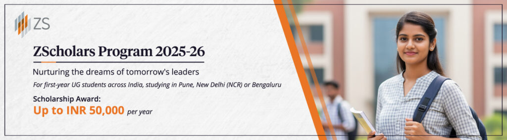 ZS Associates India Pvt. Ltd. (in partnership with Buddy4Study) invites applications for the ZScholars Program 2025-26 — a scholarship initiative to support talented students from economically challenged backgrounds. Scholarships are available for first-year students in eligible undergraduate programs at institutions located in Pune, New Delhi (NCR), and Bengaluru.